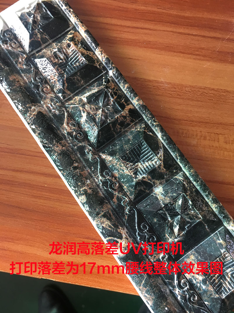 我們隨機抽取了一塊樣品進行打印,打印出來后整體效果還算滿意,客戶也能認可,然而我們那尺子測量該腰線的落差高度,才知道該腰線落差高度已經達到了17mm,比我們之前測試的15mm樣品還要高2mm,然而看細節,發虛并不嚴重,也沒有嚴重飛墨的情況出現,整體效果已經是能達到客戶的需求。